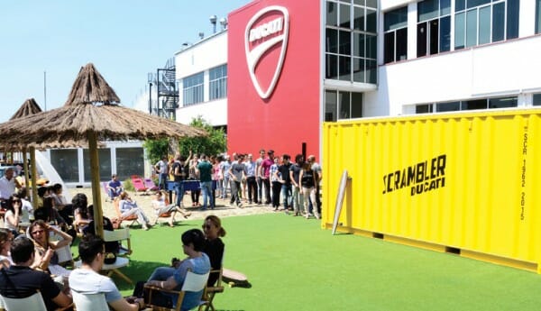 The new Ducati Scrambler will be in our showroom from February 2015 but was first seen by the Bologna factory employees today (Monday 9 June) as a surprise treat when they arrived for work and shown inside a large yellow container!