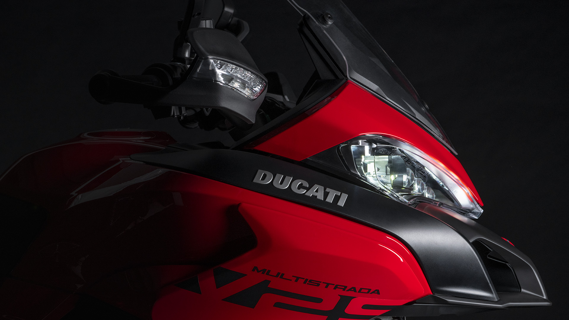 The design of the Multistrada V2 is elegant and sporty at the same time, perfectly in line with the stylistic and recognizable canons of the Borgo Panigale family of dual bikes. A style characterised by fluid lines, clean surfaces and the characteristic and distinctive balance between the important front volume and the slenderness and lightness of the rear. The Multistrada V2 also features new refined graphics, which shows the name of the bike on both sides.