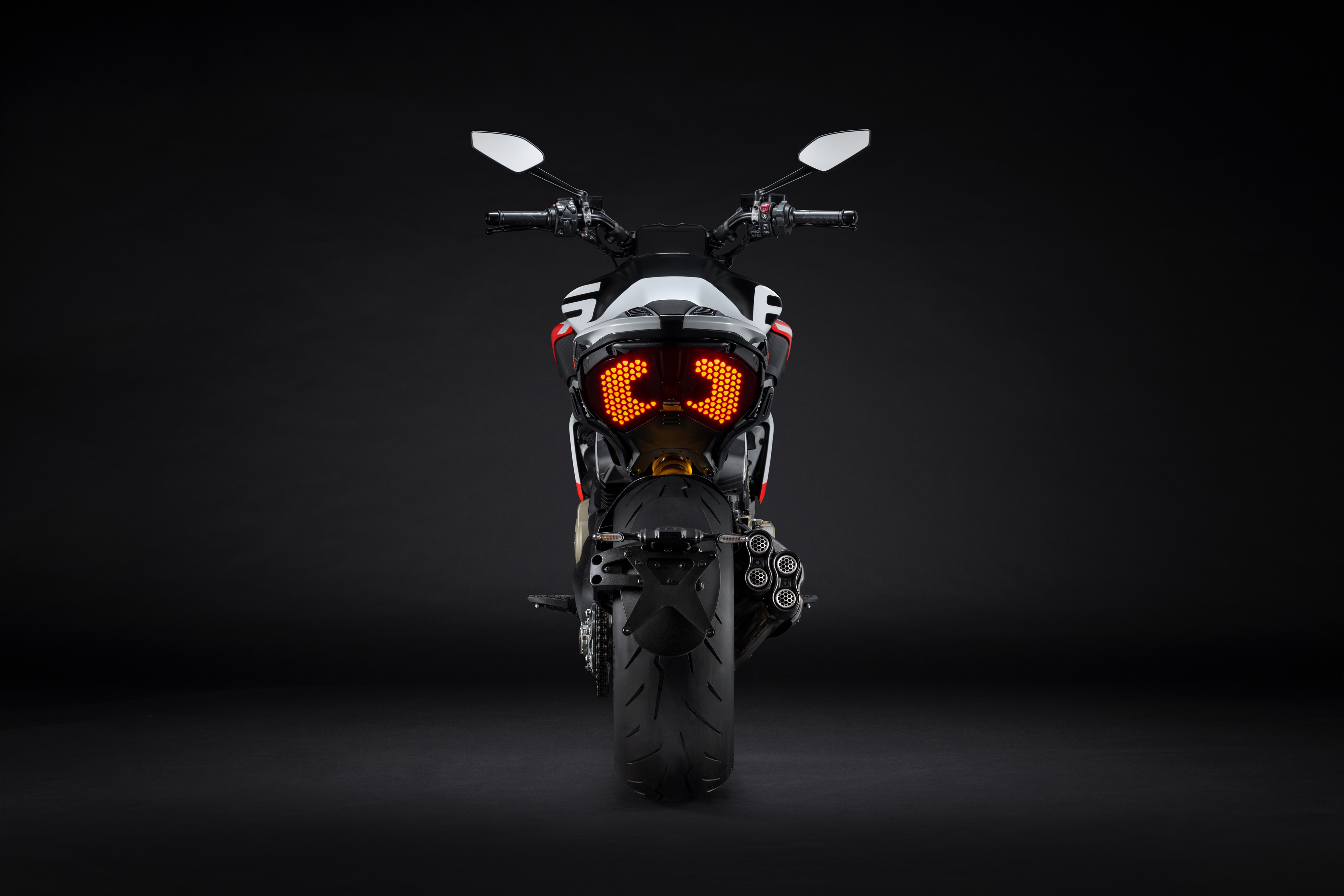The rear light cluster consists of a matrix of punctiform LEDs positioned under the tail, also with an unmistakably Diavel optical signature.