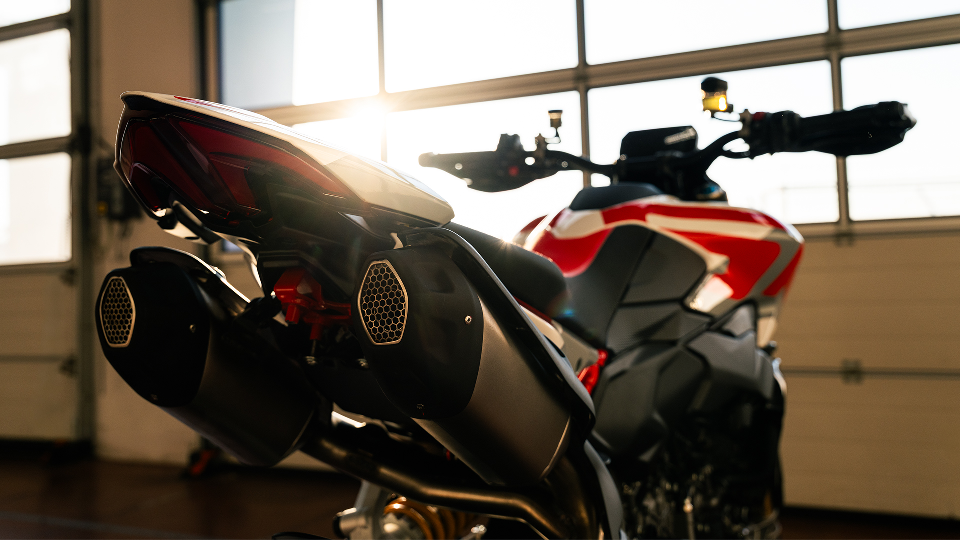 The design of the Hypermotard V2 SP is inspired by the look of the motard bikes and evolves around the double exhaust under the seat and the reduced superstructures that allow you to get a glimpse of the mechanics, including the rear trellis subframe that conveys an ultra-light and sleek mood to this version.