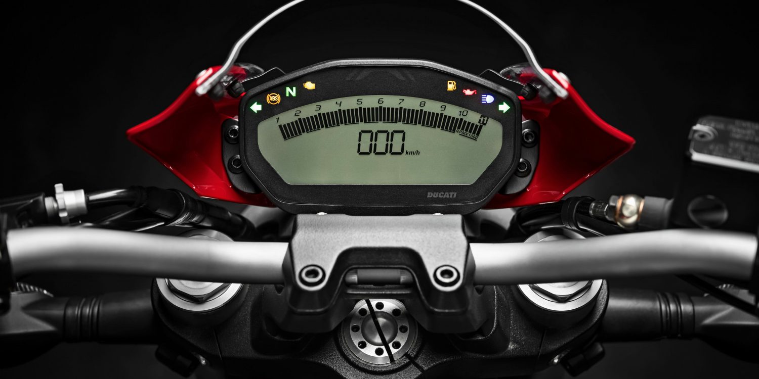 The dash of the Monster 797 comprises a large, high-visibility LCD screen, featuring the main and secondary functions. The unit provides data including speed, engine revs, total mileage, trip1 and trip2, engine oil temperature, clock, average speed and journey time.