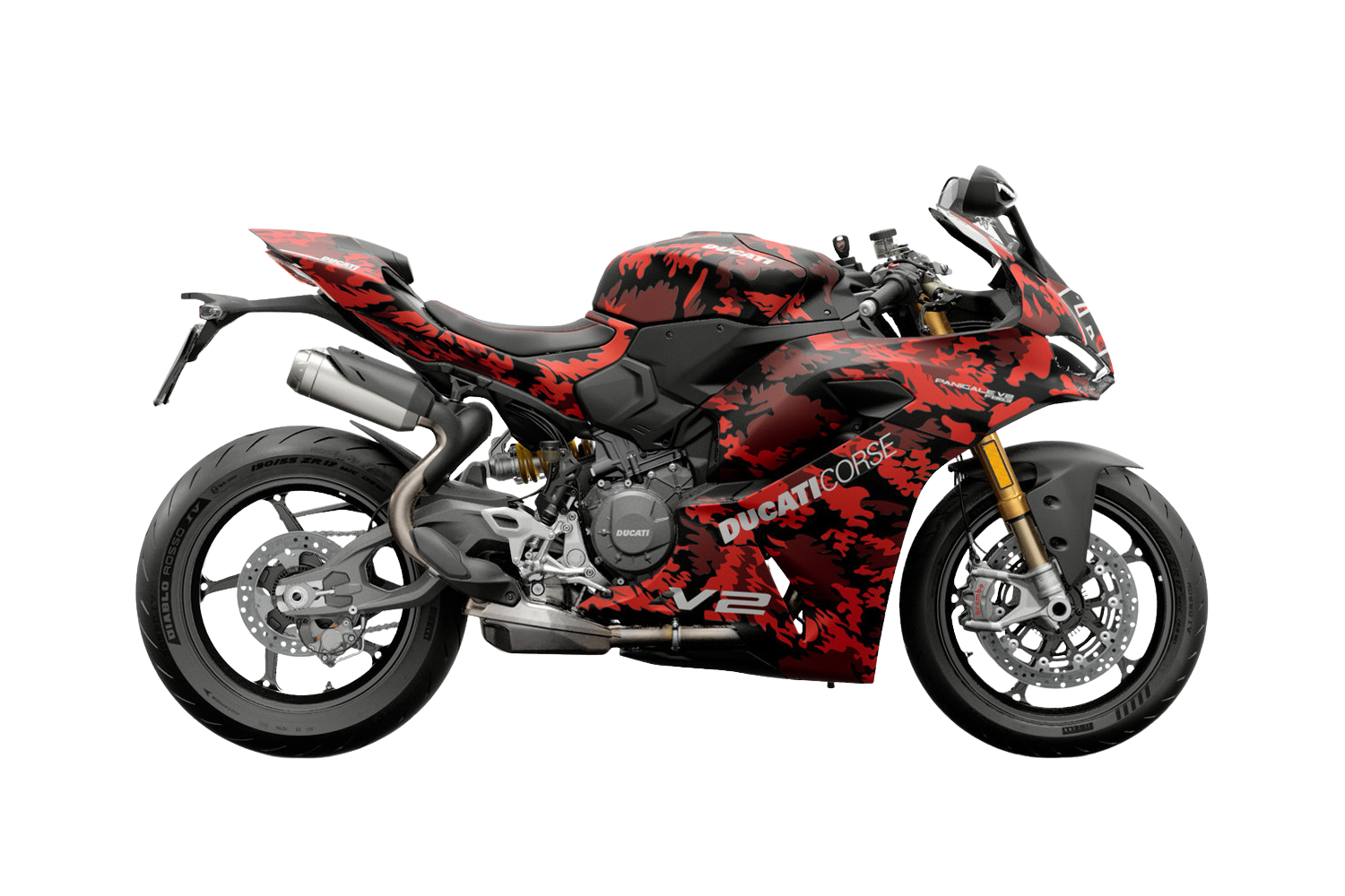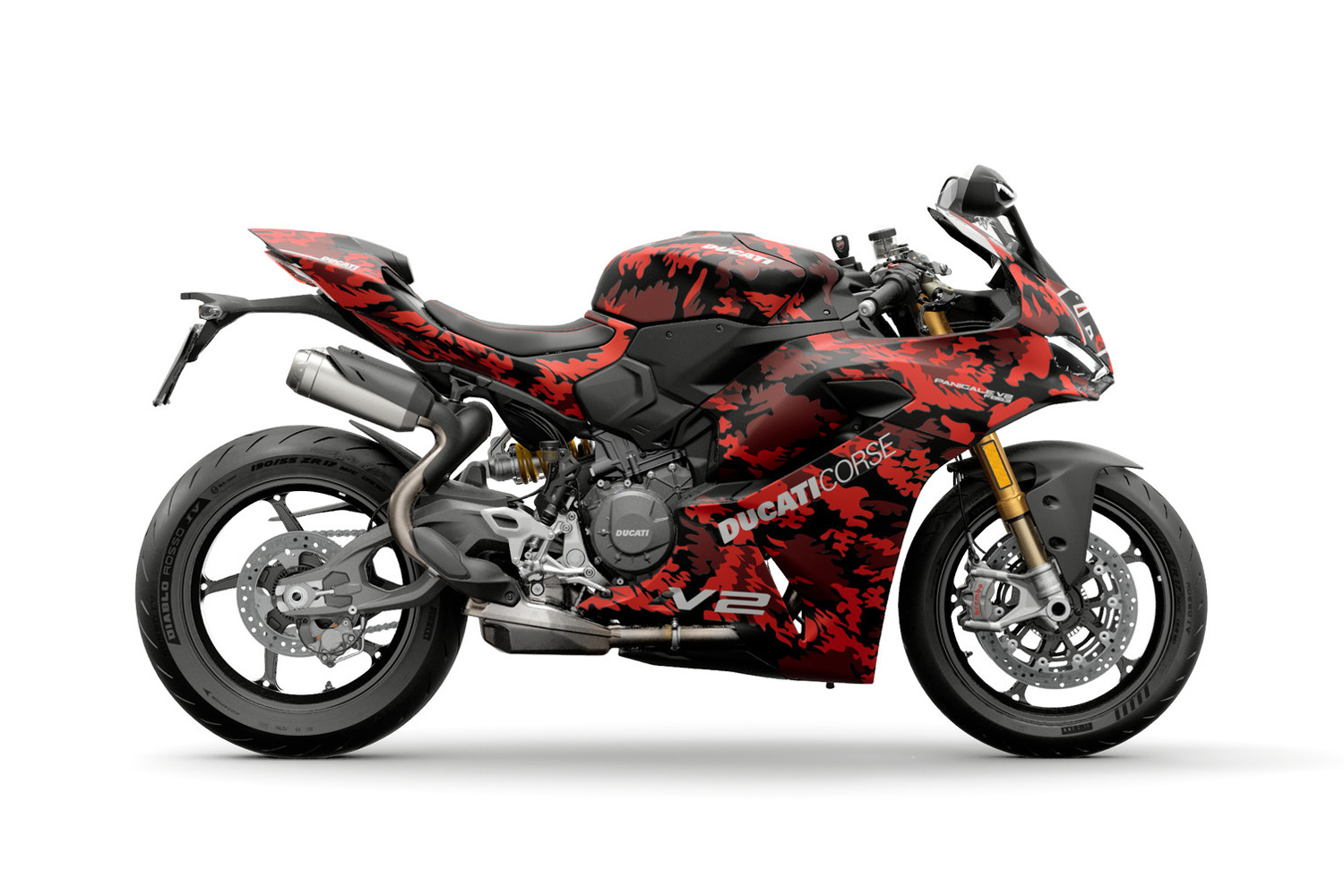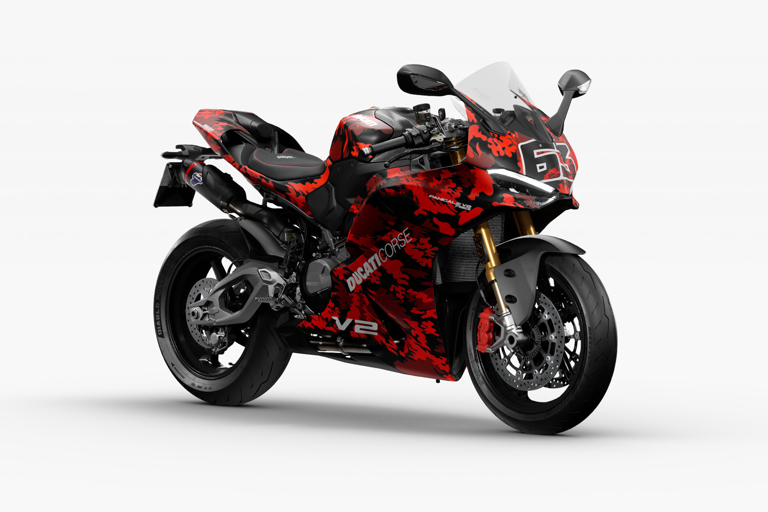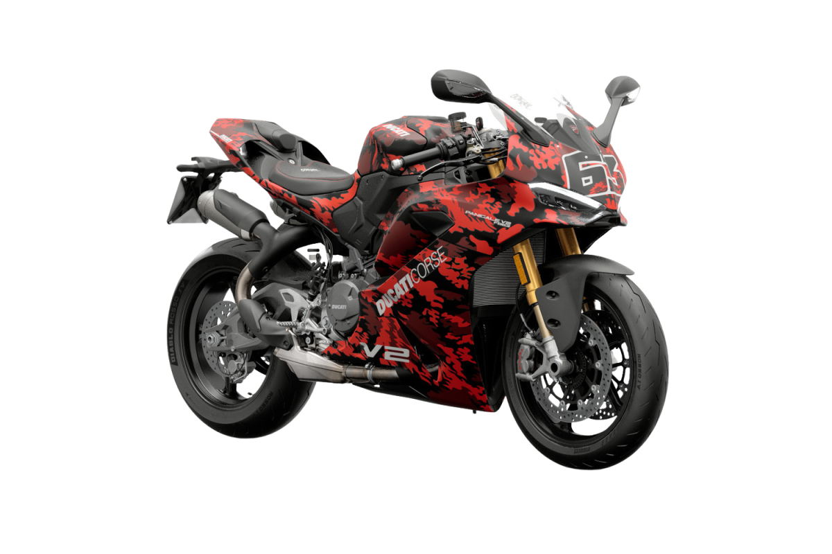Panigale V2 FB63's livery The livery of the FB63 draws inspiration from Pecco Bagnaia’s helmet for the 2025 season. The helmet featuring black and red camo. Panigale V2 MM93's livery The livery of the MM93 draws it's inspiration from the striking colours used by Marquez during the 2024 Barcelona post-season test.