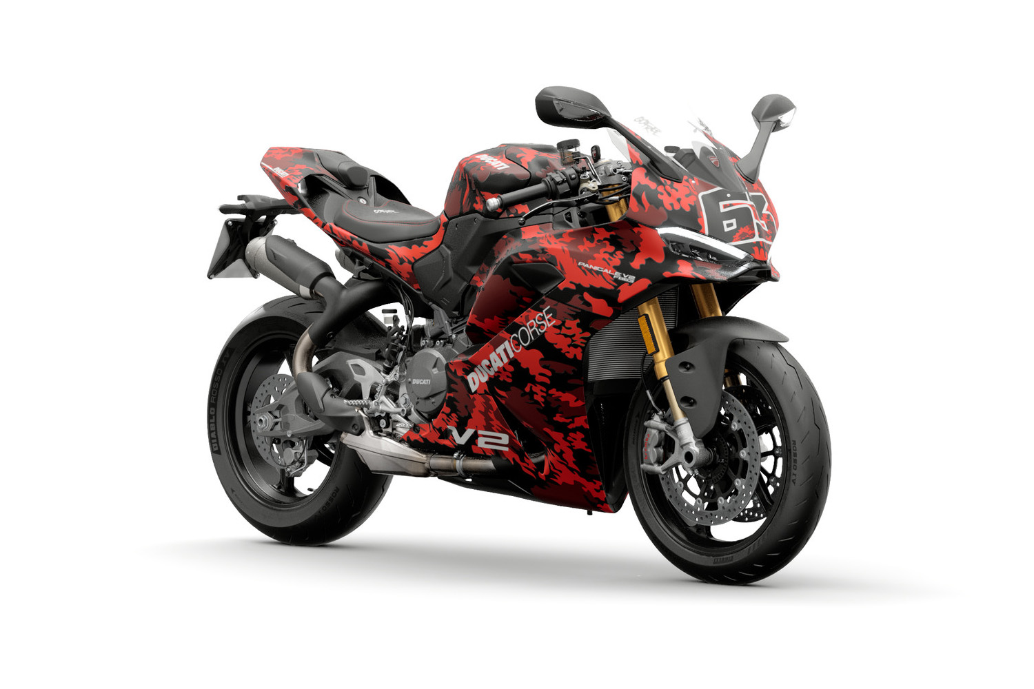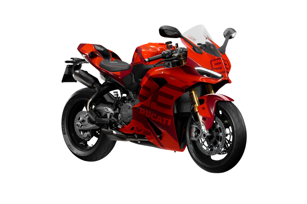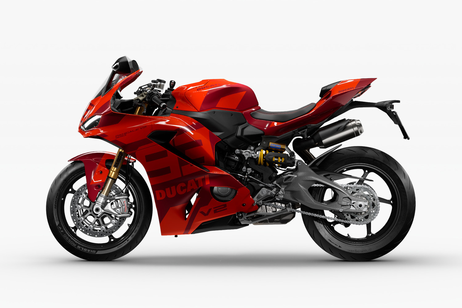 Based on the Panigale V2 S but with numerous enhancements 2 new race replica Ducati Panigale V2s are introduced, The Panigale V2 MM93 (Marc Marquez) and the Panigale V2 FB63 (Pecco Bagnaia). The enhancements over the "S" version are: forged wheels, Öhlins steering damper, lower clip-on handlebars, billet top triple clamp, sport hand grips and a larger racing screen.