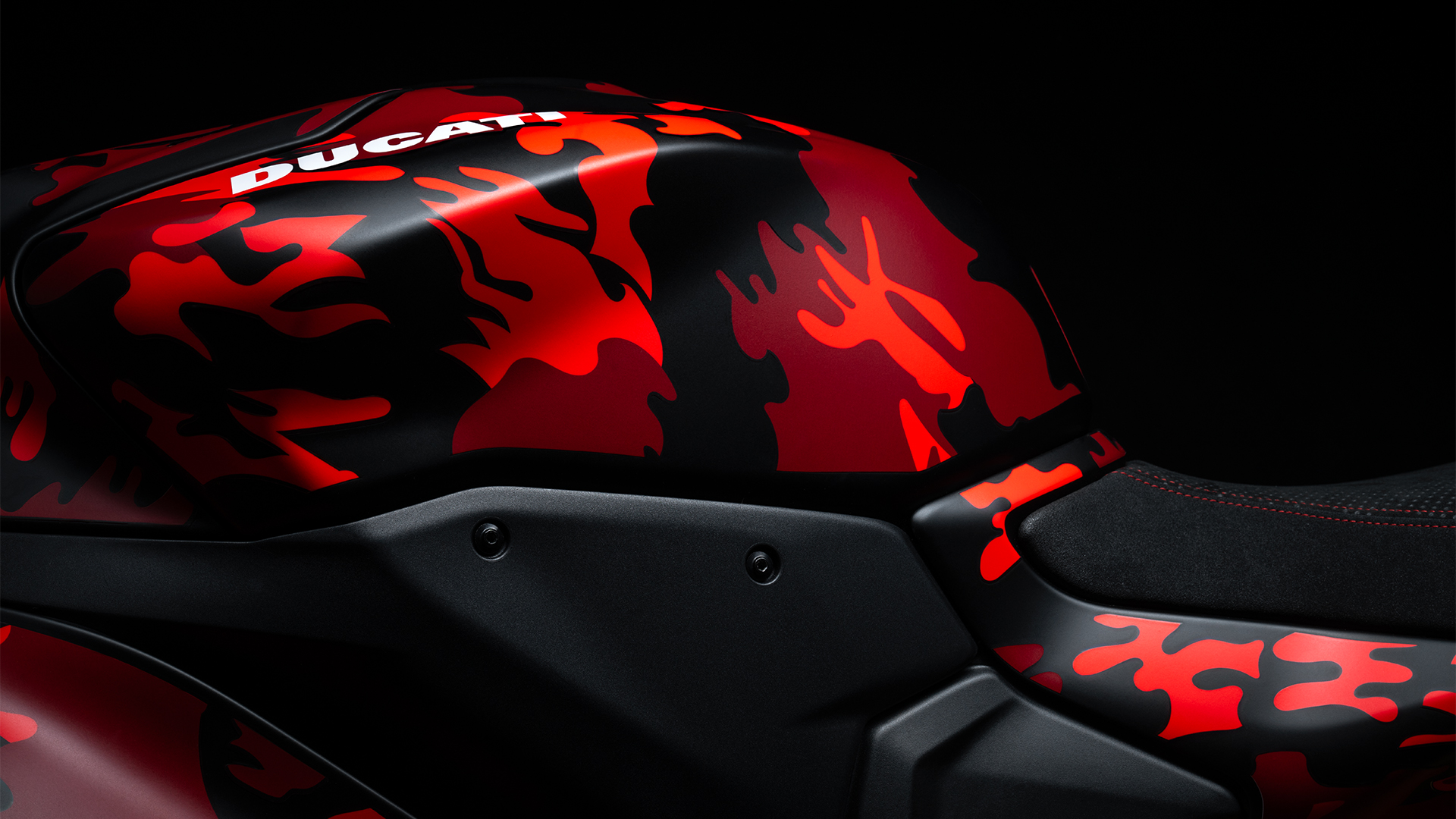Fuel tank shape, inspired by that of the new Panigale V4, delivers support in braking and “hanging off” phases.