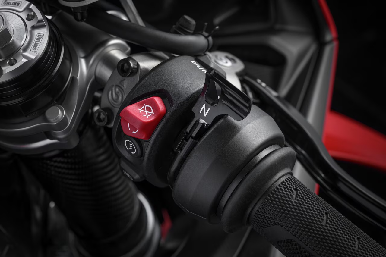 • To prevent accidental downshifting from first to neutral, the gearbox features the patented Ducati Neutral Lock (DNL), which can be deactivated using the dedicated lever on the right semi-handlebar.