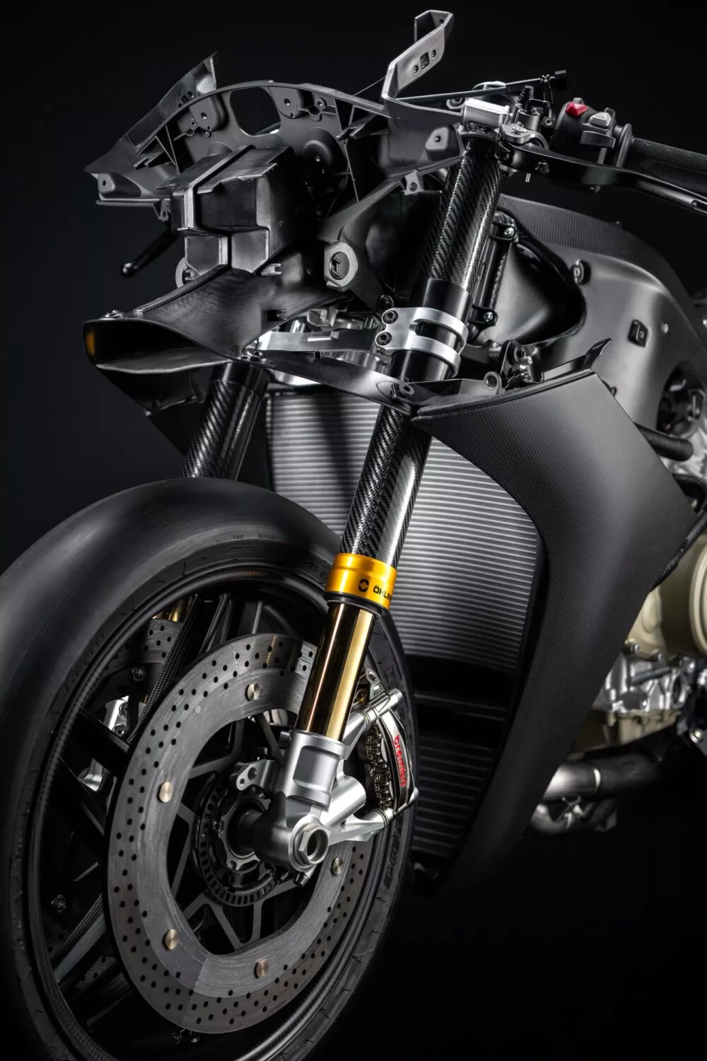 • The Öhlins NPX 25/30 Carbon with lightweight bottoms allow a weight saving of –10% vs the front forks of the Panigale V4 (–8.5% Vs Panigale V4 R)