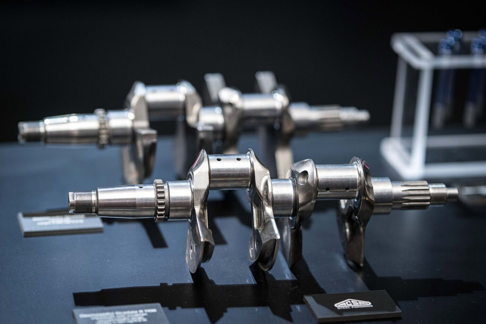 • The crank train’s weight is reduced by –1.6kg/-3.5lb vs Panigale V4 one mainly thanks to a lighter crankshaft (-1.1kg/-2.4lb) thanks to the use of high-density tungsten counterweight plugs instead of using large steel counterweights