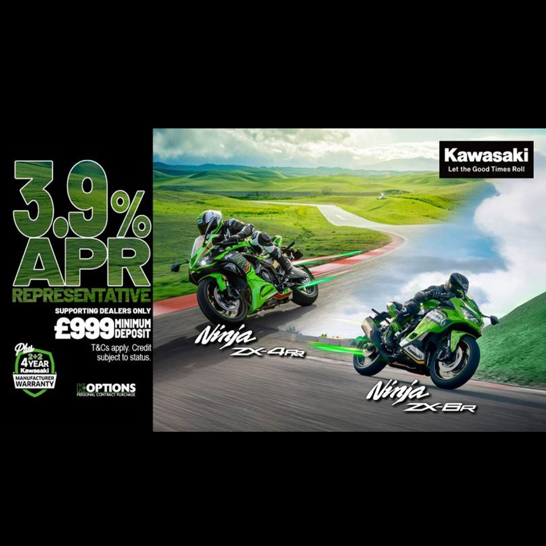 3.9% Hire Purchase or 4.9% Personal Contract Purchase over 3 years – Minimum deposit £999 –  available on the following 2024 or 2025 Kawasaki models: