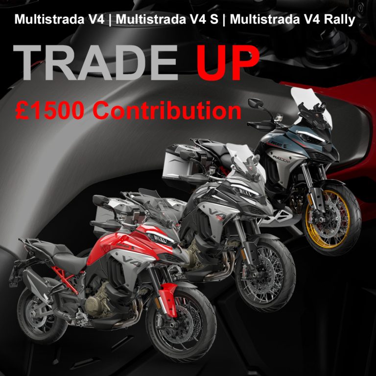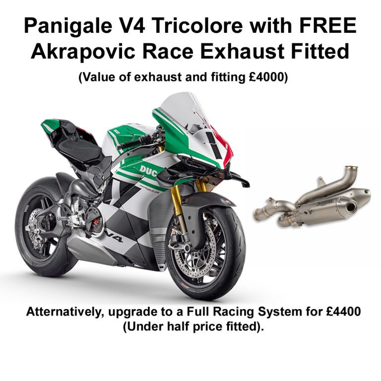 £1500 Contribution - Multostrada V4 / V4 S / V4 Rally £1000 Performance Voucher - Steetfighter & Panigale V4 & V4 S FREE Akrapovic Race Exhaust - Panigale V4 Tricolore