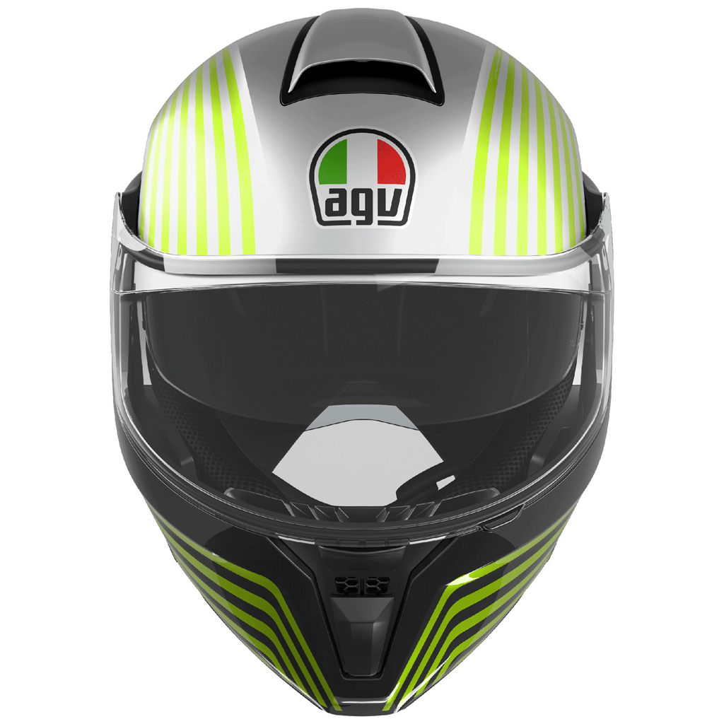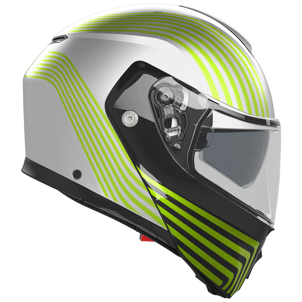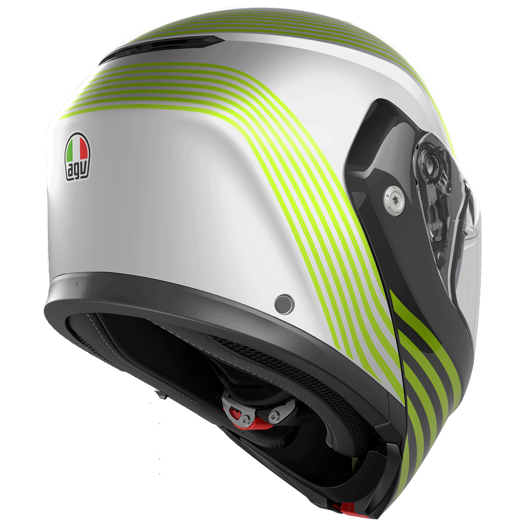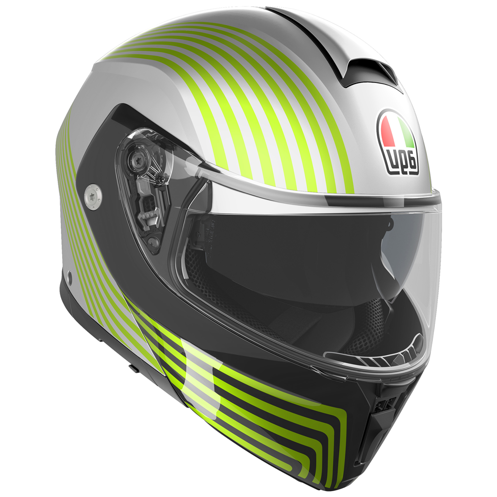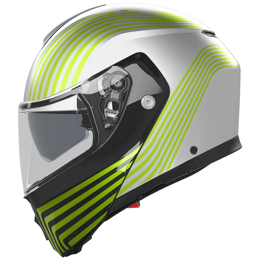 The versatility of a modular, the performance and perfection of a helmet for every day. Streetmodular is AGV?s modular helmet, designed to meet all the needs of bikers who ride every day in every situation and are looking for the ease of a flip-up helmet, with characteristics and protection at a higher level. The AGV Extreme Safety design protocol means that Streetmodular meets all the specifications of the strict ECE22.06 standard and then some, and has P/J homologation, which allows safe, street-legal use even with the chinguard open. Every detail was built for the utmost versatility ? the built-in sun visor guarantees protection and visual comfort on the brightest days, and can be operated conveniently while wearing gloves. Its construction enables perfect air flow even with the sun visor in the rest position. The Pinlock? Max Vision system included minimizes visor fogging even in the most challenging weather conditions. And with the Ultravision visor, with a 190? horizontal field of vision, you see the road, curves and obstacles earlier, for maximum control of the situation. The micrometric steel closure allows fast, precise and safe fastening. Comfort is performance. The inside of AGV Streetmodular is made of soft, resistant material that guarantees sweat absorption and quick drying. Due to the additional pads, with variable thicknesses (sold separately), the inside of the helmet can be personalized to achieve a perfect fit suited to the face and head shape. Up to 24 different configurations, for maximum comfort. Concentration on the road alone. AGV Street Modular is compatible with the dedicated integrated AGV intercom system.