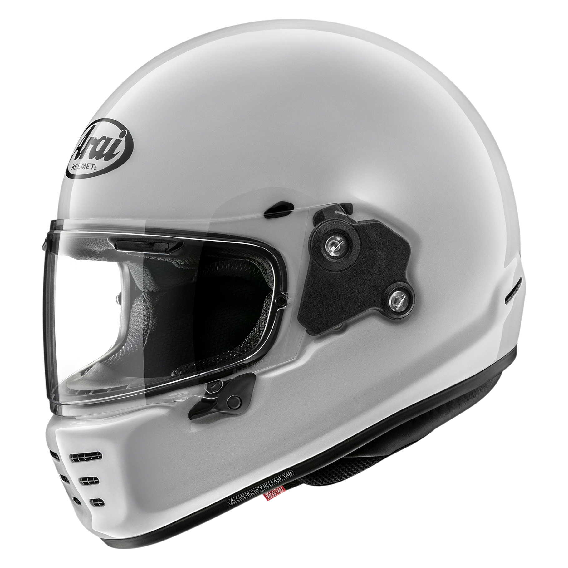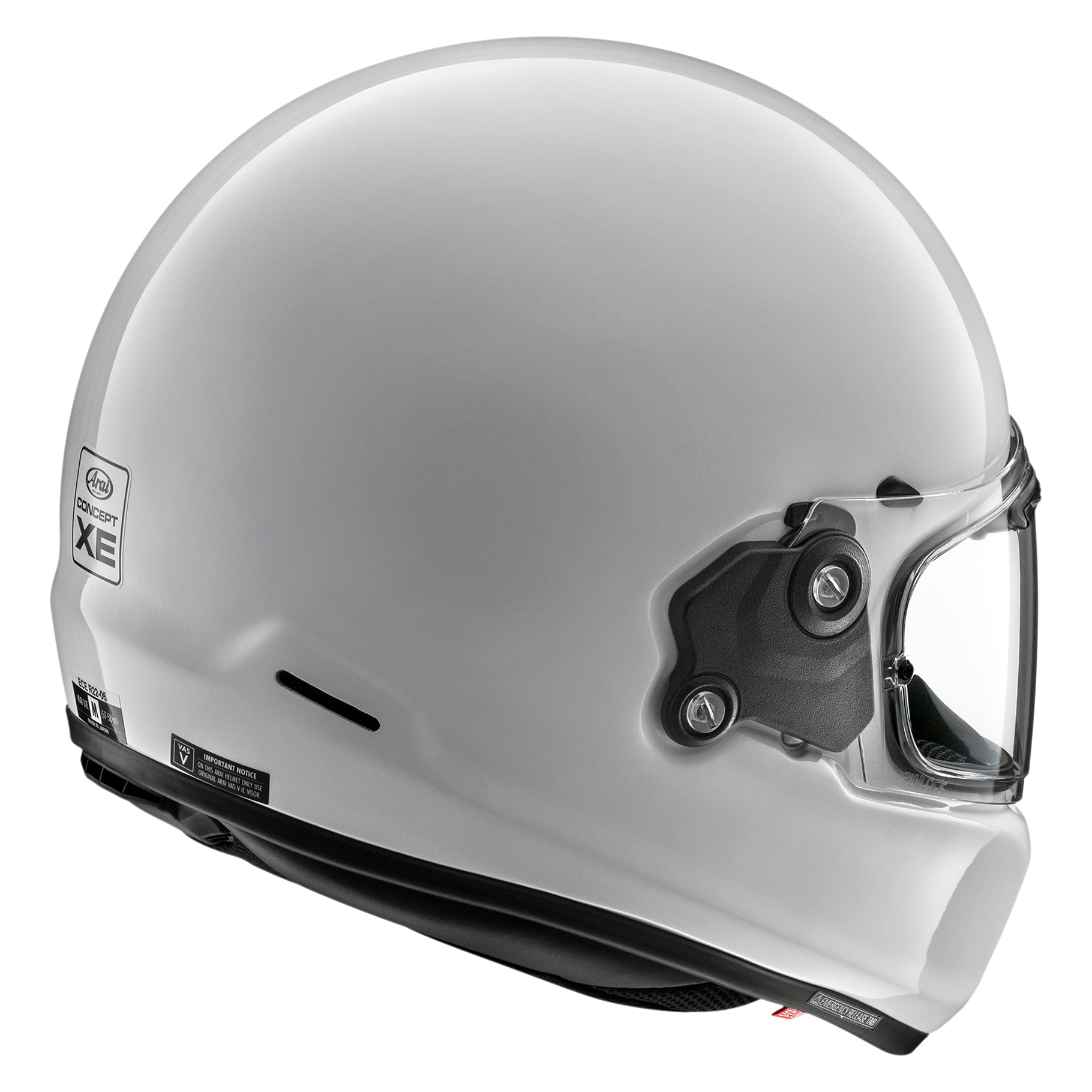 Concept-XE’s brute simplicity is the product of imagination, but make no mistake, while the retro style may grab the attention it had to pass Arai’s stringent in-house testing. So underneath the aggressive look, you’ll find a strong, lightweight PB e-cLc shell, with a smooth and round shape, reinforced with Arai’s proprietary peripheral belt, to slide across surfaces and glance-off obstacles. The VAS-VC shield system, with its retro mechanical look, further enhances glancing-off performance by lowering the visor pivot point to maximize a smooth upper shell. Although a nod to the past, the Concept-XE is very much a helmet of the present. Ready for a generation of modern riders that demand a new, old style – but with the performance and comfort only an Arai can provide. The Concept-X’s outer shell uses a Peripherally Belted e-Complex Laminate Construction (PB e-cLc) for lightweight strength; it’s designed to glance off and spread impact forces. New materials have been used to substitute the AR-mat as middle layer, resulting in a substantial weight reduction while maintaining the same strength as the PB-cLc construction. | ECE 22.06 certified includes an oblique test to measure rotation | Peripherally Belted e-Complex Laminate Construction (PB e-cLc) | Designed to glance off and spread impact forces | Variable Axis System (VAS) for enhanced shell smoothness | Strong outer shell to spread impact forces | Soft inner shell to absorb remaining energy | Hidden multi-stage air channel within the EPS liner | Air feeds into the visor brow vents and drawn through the liner | Open and close the chin bar vents from the inside | Neck and rear side exhaust vents help maintain a constant airflow | Fixed chin spoiler minimizes wind noise | VAS MAX Vision visor provides better visibility in all seasons | Visor can be opened with one finger, even while wearing gloves | Pinlock insert lens included to prevent the visor from fogging up | Antimicrobial liner and cheek pad material used | The flat and D-shaped rings fit smooth against the chin | Fully removable and washable cheek pads and interior | Integrated speaker pockets that accommodate most intercom systems | Facial Contour System (FCS) offers a more snug-fitting helmet | 5mm ”Peel Away” Ear cups/Cheek pads for a personalised fit | Emergency Release System (ERS) for quick removal | Breath guard to better direct fresh air | Each Arai helmet goes through five separate quality-control departments | Penetration tested, although not required by European helmet standards