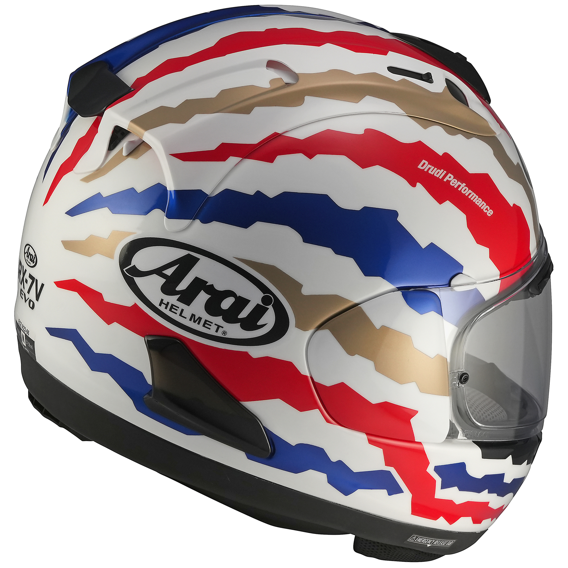 Head protection means managing impact energy. Many understand it to be about absorbing energy, but Arai believes that’s just one part of impact energy management. The lower the impact energy, the less needs to be absorbed. Arai does that by making a rounder, smoother and stronger outer shells to improve Glancing Off performance and reduce impact energy transferring into the helmet. This is unique to Arai and their core philosophy. The RX-7V EVO, is packed with seven decades of experience and is the new flagship model with proven Arai protection, combined with the ECE R22.06 approval. It’s not just a new model, it’s a new benchmark. ECE R22.06 requires a much more stringent testing process than the previous ECE R22.05. Arai presented the RX-7V EVO and it gained homologation while maintaining its characteristic round, smooth and strong shell design to ‘glance-off’ and spread impact forces| Lightweight and strong PB-SNC2 outer shell construction | Glancing off design minimises impact energy getting inside | Each Arai goes through five separate quality-control zones | Centre duct and lowered side-air channels provide airflow | Intake scoops worth with air wing for added stability | Chin cover blocks unwanted air intrusion | 20mm longer and straighter diffuser enhances aerodynamics | Fresh air can enter directly to the forehead area | Three-position chin vent helps in demisting the visor | Side exhausts produce low pressure to better vent hot air | Pull Down Chin Spoiler helps minimize wind noise | VAS (Variable Axis System) Pinlock ready Max Vision visor | One-finger operation visor latch system | Pinlock insert anti-fogging insert is included | Antimicrobial internal materials used throughout | Removable and washable cheek pads and skull liner | Replaceable chinstrap covers and neckroll | Integrated speaker pockets for intercom systems | Facial Contour System offers a better, snug fit | 5mm ”Peel Away” cheek pads and temple customises fit | Emergency Release System (ERS) for use in accidents | Breath guard directs hot breath downwards | Strong Double-D chin strap