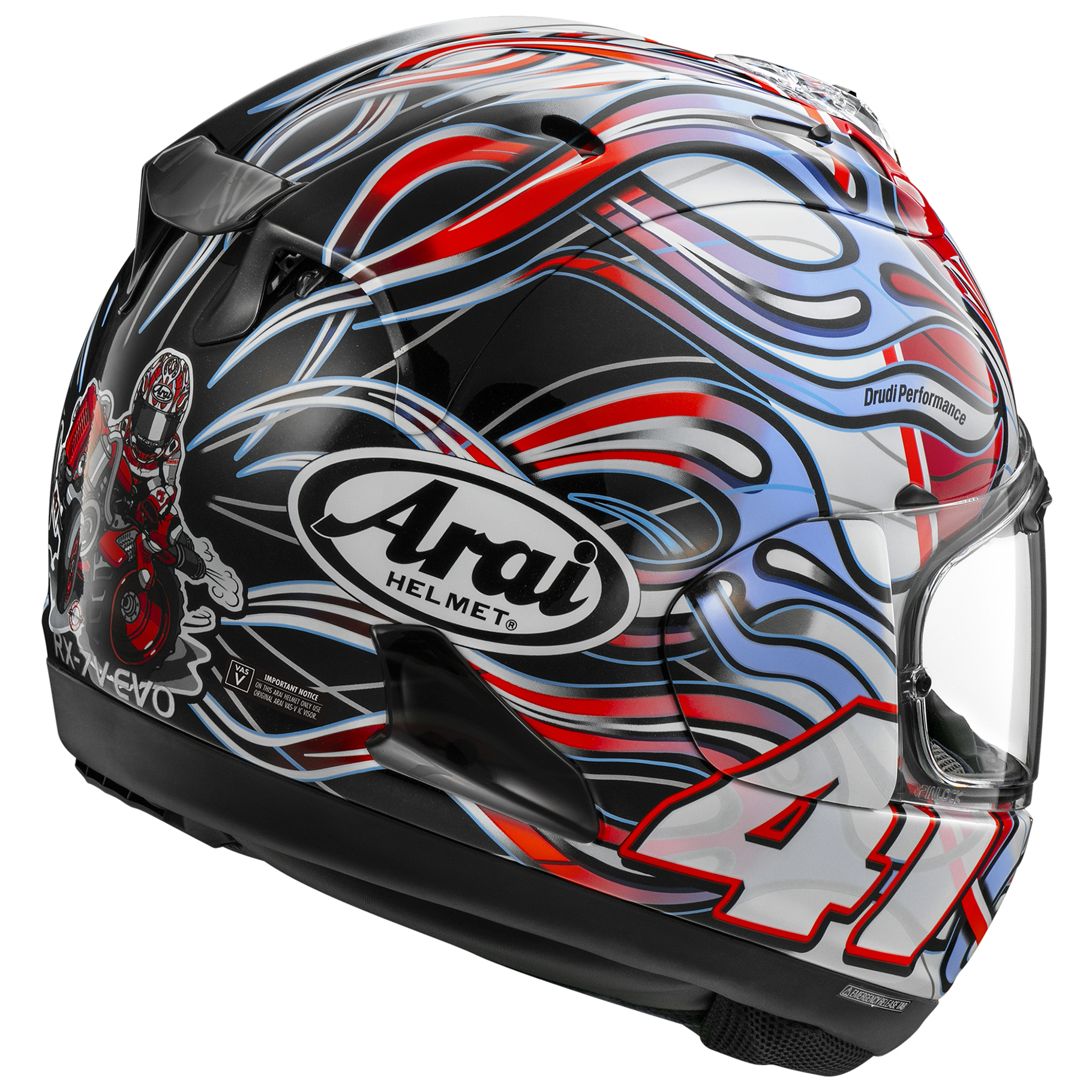 Head protection means managing impact energy. Many understand it to be about absorbing energy, but Arai believes that’s just one part of impact energy management. The lower the impact energy, the less needs to be absorbed. Arai does that by making a rounder, smoother and stronger outer shells to improve Glancing Off performance and reduce impact energy transferring into the helmet. This is unique to Arai and their core philosophy. The RX-7V EVO, is packed with seven decades of experience and is the new flagship model with proven Arai protection, combined with the ECE R22.06 approval. It’s not just a new model, it’s a new benchmark. ECE R22.06 requires a much more stringent testing process than the previous ECE R22.05. Arai presented the RX-7V EVO and it gained homologation while maintaining its characteristic round, smooth and strong shell design to ‘glance-off’ and spread impact forces| Lightweight and strong PB-SNC2 outer shell construction | Glancing off design minimises impact energy getting inside | Each Arai goes through five separate quality-control zones | Centre duct and lowered side-air channels provide airflow | Intake scoops worth with air wing for added stability | Chin cover blocks unwanted air intrusion | 20mm longer and straighter diffuser enhances aerodynamics | Fresh air can enter directly to the forehead area | Three-position chin vent helps in demisting the visor | Side exhausts produce low pressure to better vent hot air | Pull Down Chin Spoiler helps minimize wind noise | VAS (Variable Axis System) Pinlock ready Max Vision visor | One-finger operation visor latch system | Pinlock insert anti-fogging insert is included | Antimicrobial internal materials used throughout | Removable and washable cheek pads and skull liner | Replaceable chinstrap covers and neckroll | Integrated speaker pockets for intercom systems | Facial Contour System offers a better, snug fit | 5mm ”Peel Away” cheek pads and temple customises fit | Emergency Release System (ERS) for use in accidents | Breath guard directs hot breath downwards | Strong Double-D chin strap