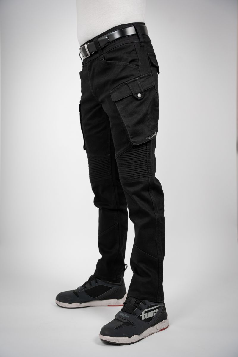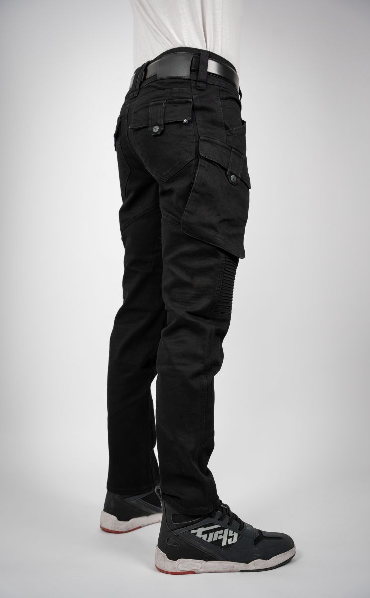 Easy fit sizes 30-52 (Short, Reg, Long). Jet black combat denim with stretch panels, side pockets and expandable hem. Mid rise. Covec Oneskin jet black denim shell. RE ZRO level 1 hip and knee armour included. CE 17092-3:2020 (AA-rated). Matt black metal YKK and fastenings. High-vis reflective tape. Embroidered Bull-it ‘bull head’ logo.