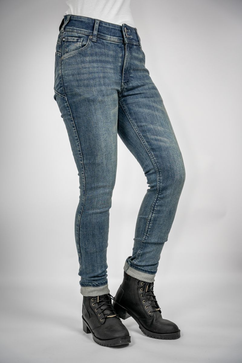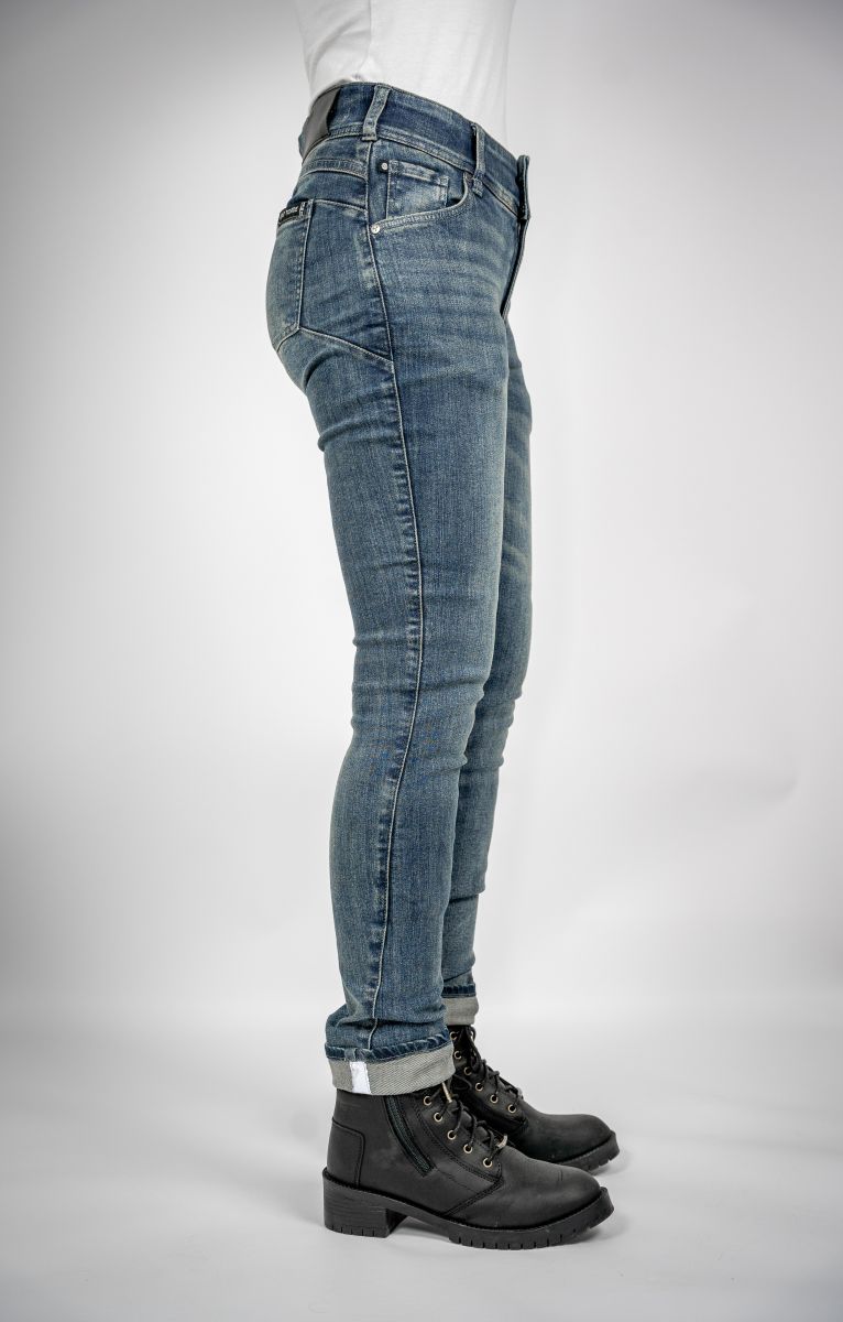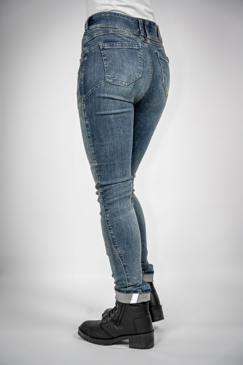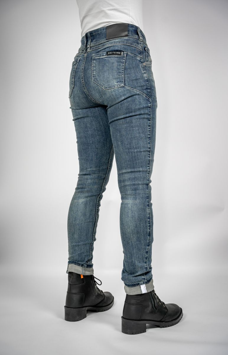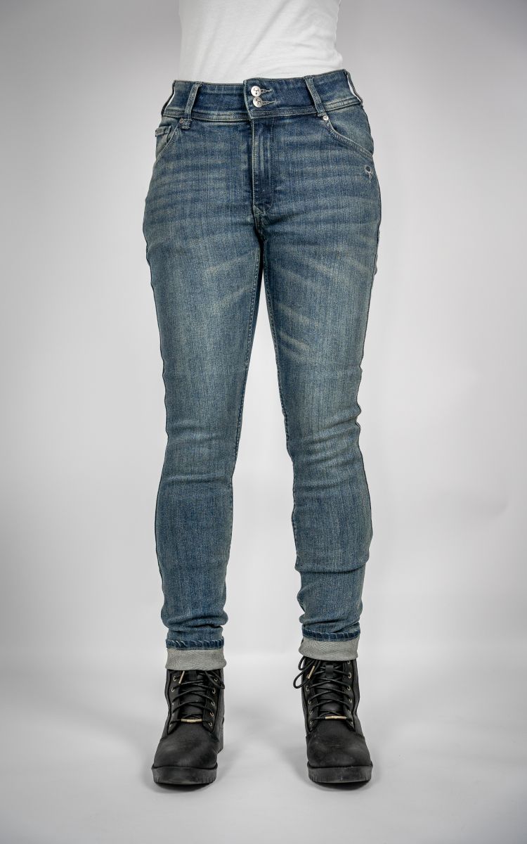 Slim fit sizes: UK 6 – 16 Short/Reg/Long. Mid steel blue denim with a washed-out whisker finish and matching grey stitching. Mid rise. Covec Oneskin Grey blue denim shell. RE ZRO level 1 hip and knee armour included. CE 17092-3:2020 (AA-rated). Twin silver shank, rivets and YKK zipper. High-vis reflective tape. Embroidered Bull-it bull head logo.