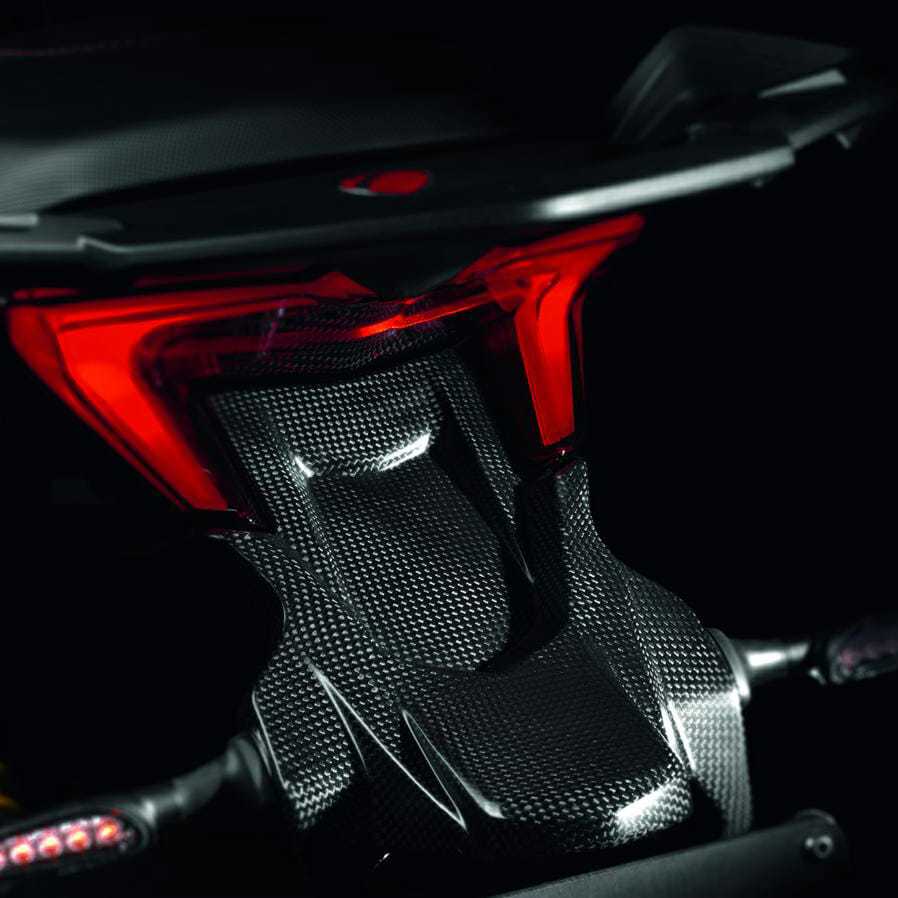 The lightness and strength of carbon fibre are combined with a captivating design in an accessory that embellishes the rear end of the bike, making it even more unmistakable.