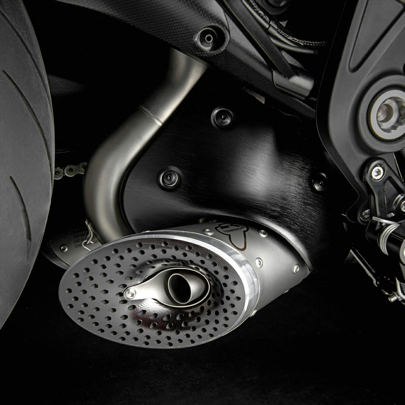 The complete exhaust system was designed to bring out the high torque and power performance of Diavel 1260, and with a special care devoted to highlight the look of the muscle-cruiser par excellence. The exhaust system is made of steel, more resistant, while endcaps are of billet aluminium alloy with the classic slice cut. Installing the complete exhaust system improves both torque and power over the enTyre range of engine rpm in order to further improve the performance of the bike. The Diavel’s look is transformed with the installation of the exhaust system thanks to the outlets on both sides and the aluminium endcap skilfully machined. Power at medium rpm [hp] +6, Torque at medium rpm [Nm] +5, Max. Power [hp] +10, Max. Torque [Nm] +10. Up to MY20