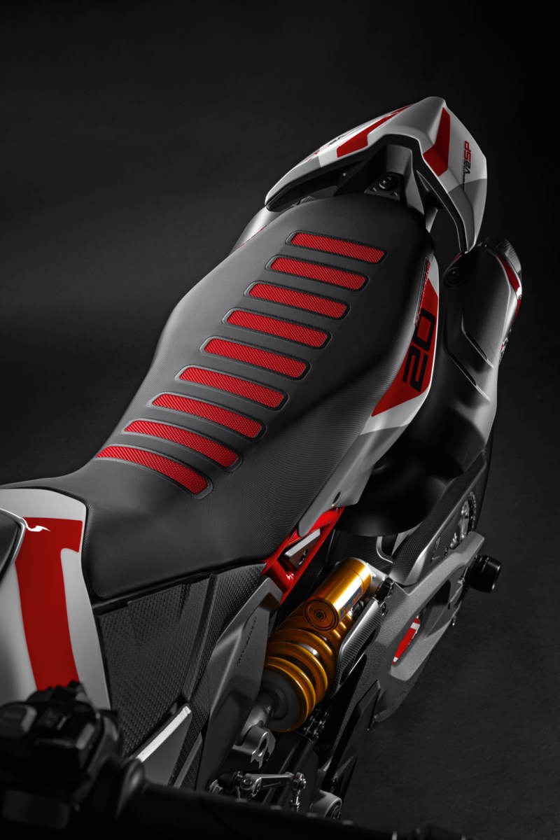 Profile designed for track use to accentuate the riding position on the front end, thus facilitating handling and control of the bike. The special fabric with which the upholstery is made prevents the rider from slipping, thus allowing a greater grip between suit and seat than the standard seat. Height same as the OEM seat.
