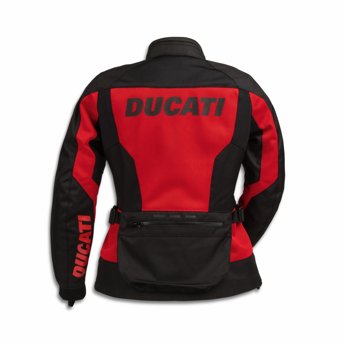 Developed by Spidi exclusively for Ducati, the fabric Tour Summer C1 jacket is a breathable, versatile, and fully certified garment. Made from polyester mesh with abrasion-resistant Tenax stretch fabric inserts, it offers maximum ventilation thanks to generous airflow provided by the large mesh areas. The jacket features a detachable H2Out membrane made of 2-layer laminated fabric, which is waterproof, windproof, and breathable, and can be worn either over or under the main jacket as rain or wind protection, or even used separately. The interior incorporates Warrior Lite protectors on the shoulders and elbows, and is designed to accommodate a back protector (sold separately). It’s a garment that offers maximum comfort and practicality, thanks to the zipper that allows the jacket to be joined with their matching trousers, the comfortable neoprene cuffs, and the big pocket on the back for storing the membrane when not in use. It also features a handy waterproof inside pocket to keep documents and personal effects dry at all times. The reflex prints increase visibility and add a touch of style to the garment’s already unmistakable red design. Available in both women’s and men’s versions, this jacket is dedicated to Ducati enthusiasts who love to venture out in the middle of summer or discover exotic destinations, whether on their own or as a couple. | OUTSIDE | 330 g/m2 stretch Tenax polyamide fabric (abrasion resistance of 200 Martindale cycles). 350 g/m2 polyester fabric (abrasion resistance of 140 Martindale cycles). 280 g/m2 600 polyester fabric (abrasion resistance of 254 Martindale cycles) | INSIDE | Detachable H2Out membrane, waterproof, windproof and breathable made of 2-layer laminated fabric that can be worn either over or under the main jacket. The membrane can also be used separately | PLUS | Waterproof internal pocket. YKK zipper. 2 outer pockets1 back pocket. Jacket-to-trousers zipper. Reflex prints | COMFORT | 100% ventilated. Neoprene cuffs. Adjustable waist fastening
