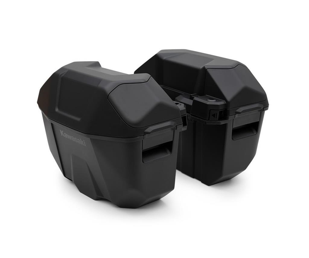 Kawasaki Quick Release (KQR) pannier system with 2x21L capacity. Secure your personal items in 2 x 21 litres of lockable storage. Utilizes the Kawasaki One Key System, allowing you to use your ignition key for unlocking the top lid. 21 Liter side cases clip to sturdy steel support brackets and lock to it with iginition key. Saddlebag dimensions: L=467mm (18.4?), W=238mm (9.4?) H=351mm (13.8?). Silver resin additional side panel set provides color accents a to give adventure-style looks. The ability to carry two Kawasaki panniers and a Kawasaki top case at the same time give you many options for touring setups. Pannier system consists of 5 items:
