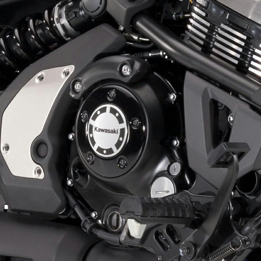 Black clutch cover plate with aluminium colored insert with Kawasaki logo.