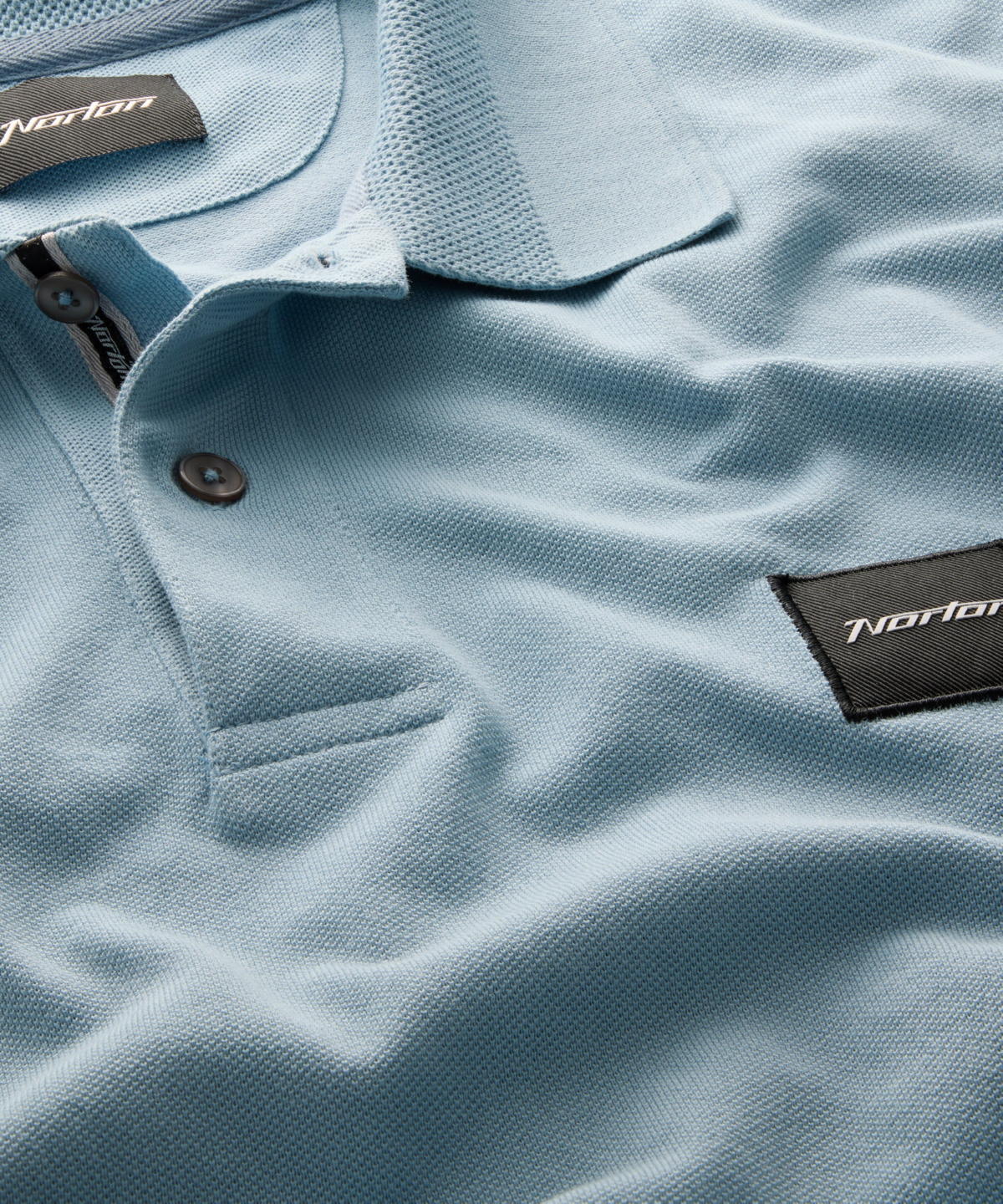 This piqué jersey blue polo shirt offers a sharper alternative to the T-shirt. Made from 100% cotton, it features a small embroidered Norton logo badge on the left chest for a subtle, refined signature. Product Information: 100% Cotton Short Sleeved Norton badge detail 190 GSM