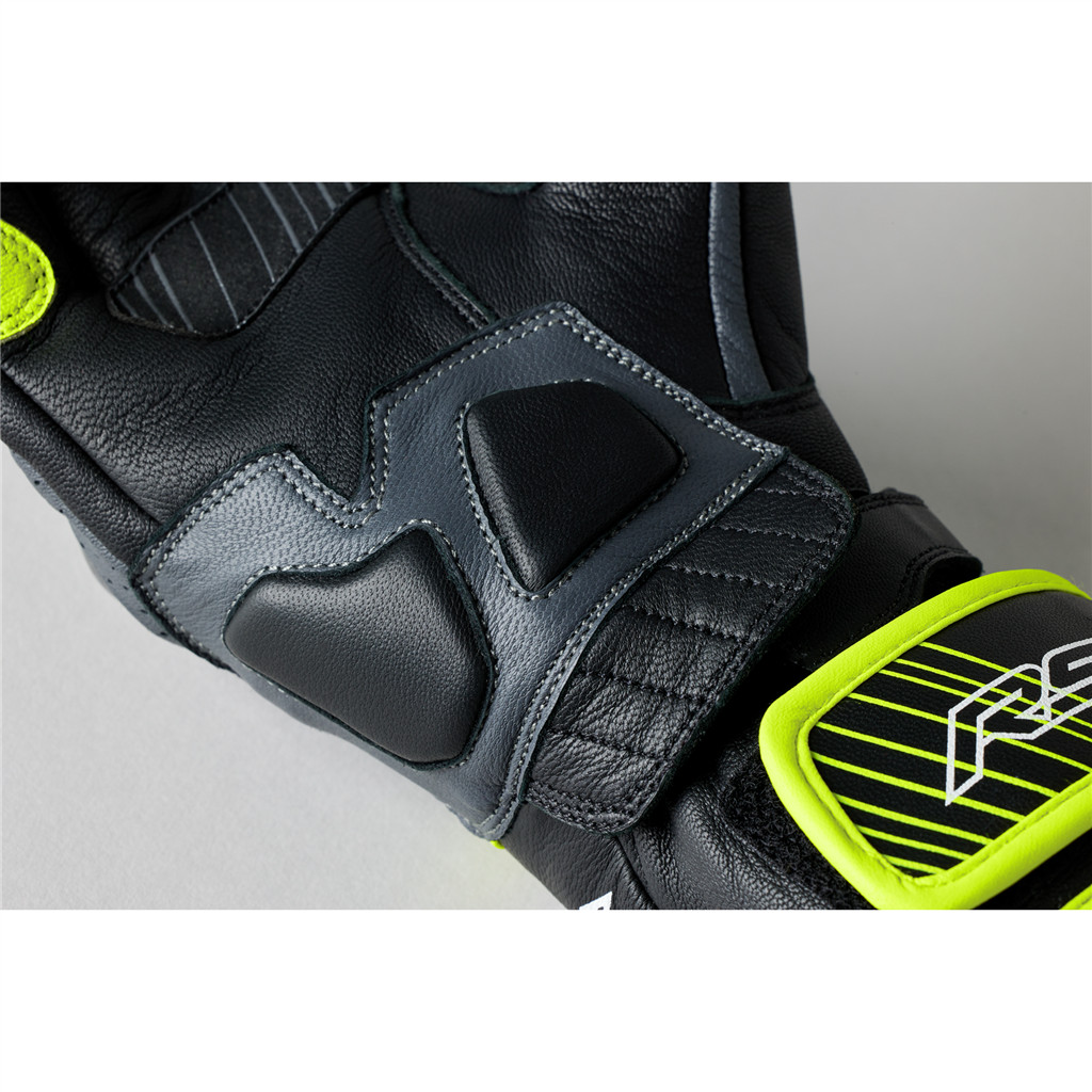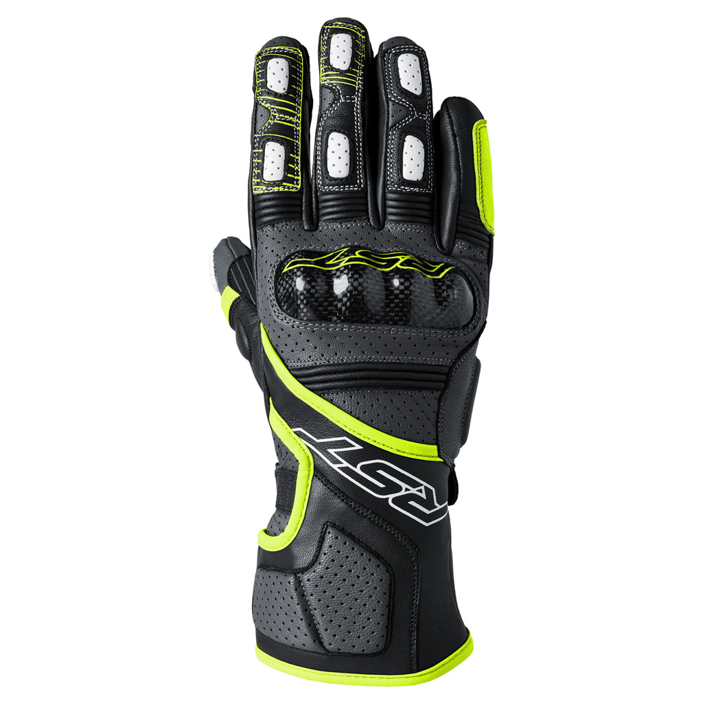 The Fulcrum is RST?s brand-new sports glove designed with an acknowledgement to street riding. Featuring carbon fibre knuckle protectors, out-stitched pre-curved fingers, digital touch leather on both the thumb and forefinger, double layer leather on the palm and power grip for additional grip on the handlebars. The Fulcrum is also available in a waterproof version. | Cuff and wrist adjusters | Double layer leather at palm | Perforated leather | Motion panels | Palm grip