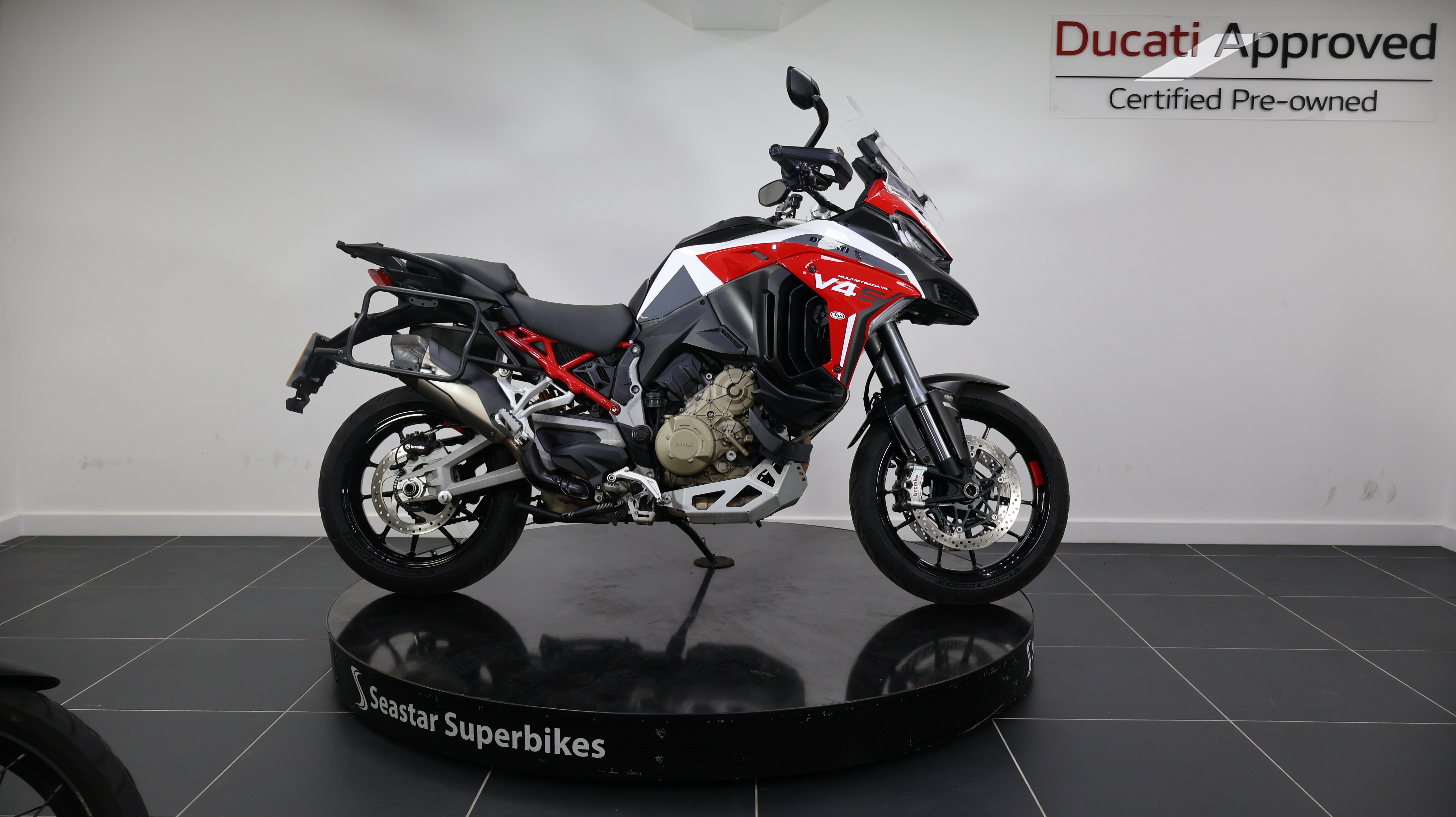 Here at Seastar, we are proud to offer this exceptional 2021 Ducati Multistrada V4 S. As one of Ducati’s most advanced touring motorcycles, it features the powerful V4 Granturismo engine delivering strong performance and smooth power delivery, combined with advanced rider aids for enhanced safety and control. This example is fitted with Bumot aluminium panniers, heated seats, heated grips, and a centre stand, making it perfectly suited for long distance touring and all weather riding. With its refined styling, semi active suspension, and excellent comfort, this bike is built to conquer every road with confidence and class.