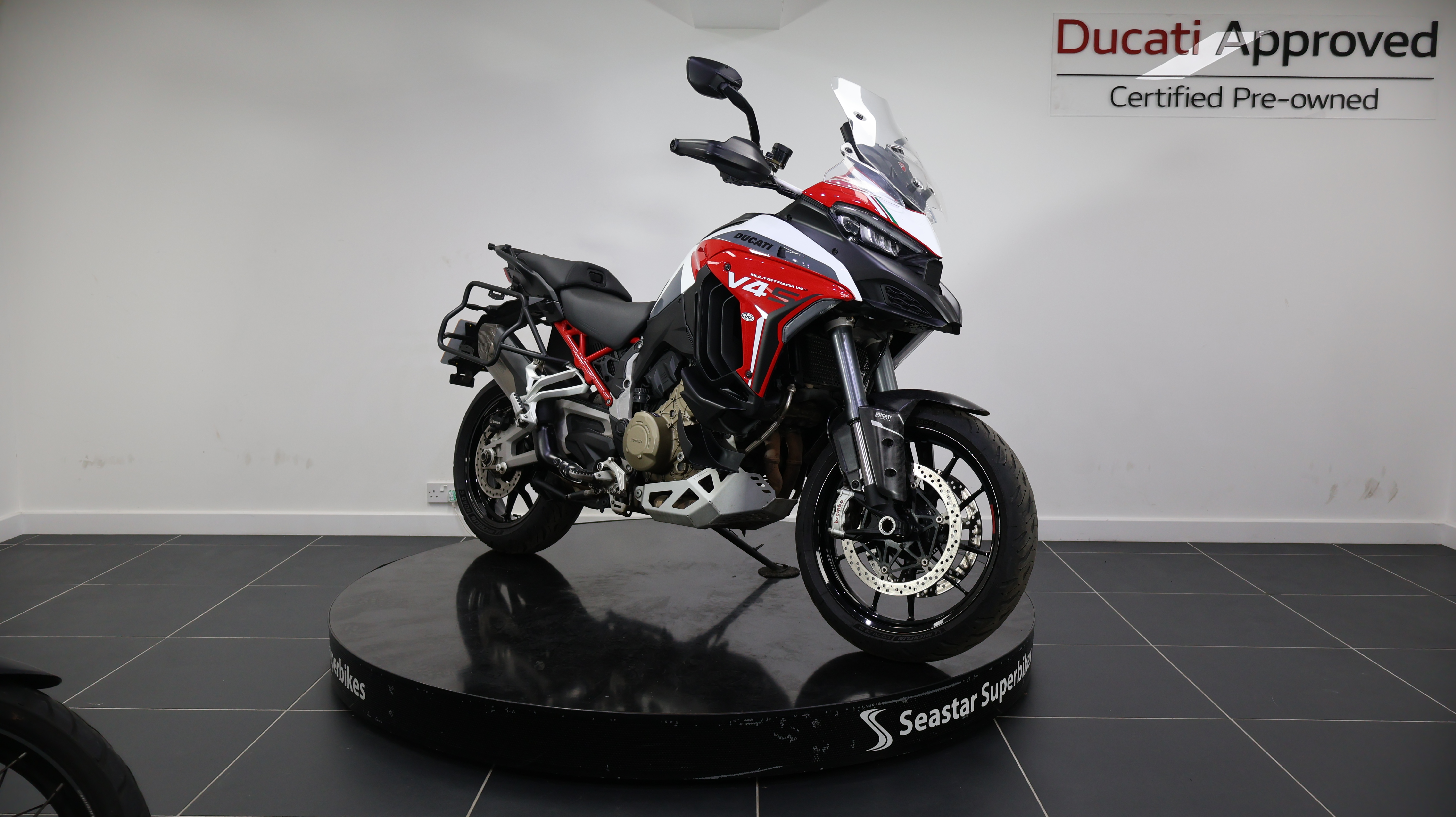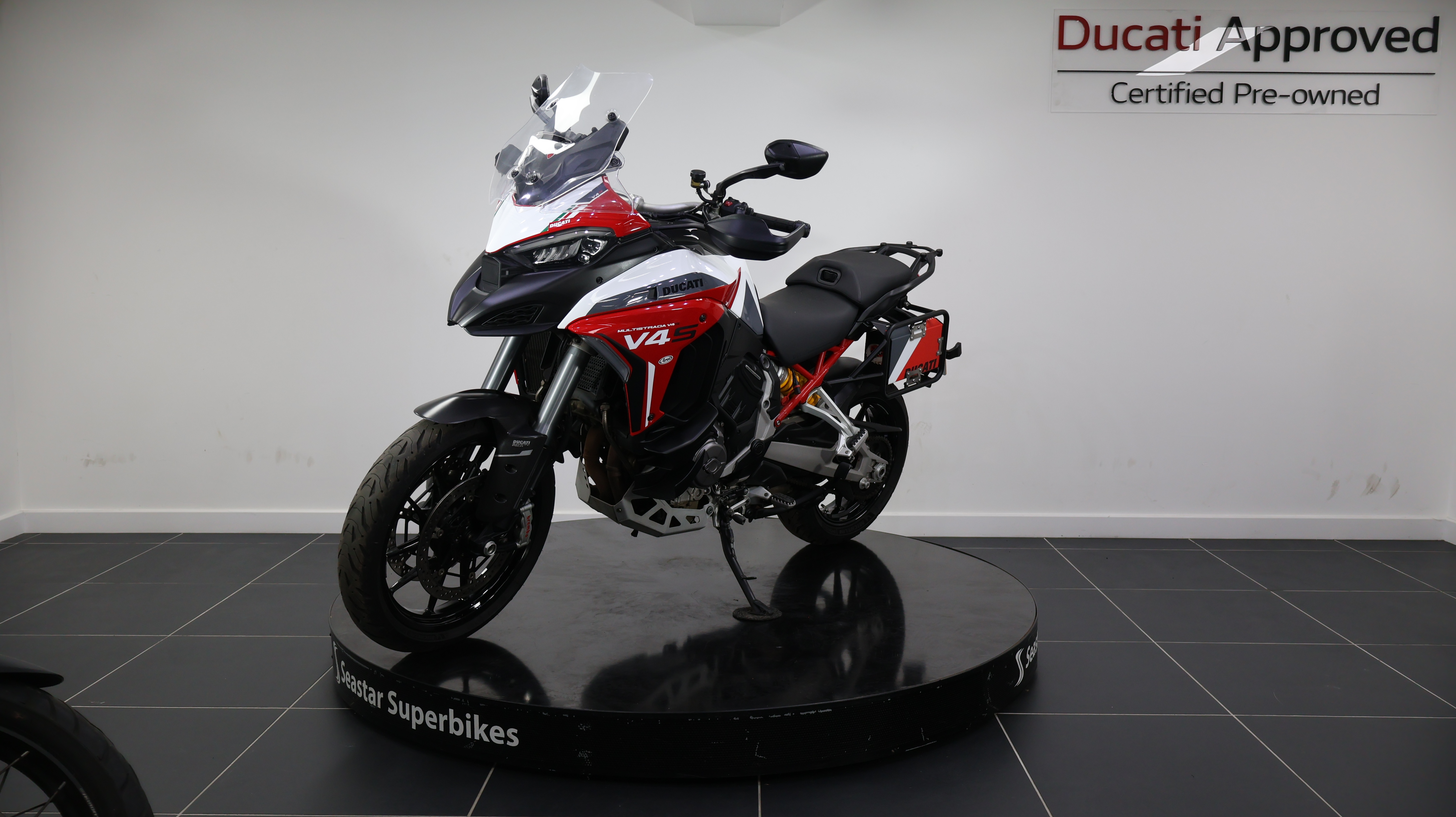 Designed for versatility, the Multistrada V4 S comes equipped with a comprehensive electronics package including multiple riding modes, traction control, wheelie control, cornering ABS, and cruise control. Its semi active suspension automatically adjusts to road conditions and riding style, providing a smooth and controlled ride whether on motorways, country roads, or more challenging terrain.